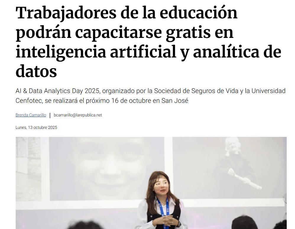 AI & Data Analytics Day 2025, organizado por la Sociedad de Seguros de Vida y la Universidad Cenfotec, se realizará el próximo 16 de octubre en San José. https://www.larepublica.net/noticia/trabajadores-de-la-educacion-podran-capacitarse-gratis-en-inteligencia-artificial-y-analitica-de-datos