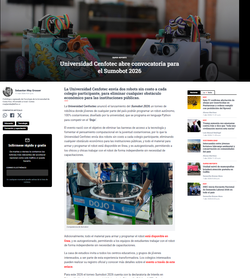La Universidad Cenfoctec anunció el lanzamiento del Sumobot 2026, un torneo de robótica donde jóvenes de cualquier parte del país podrán programar un robot autónomo, 100% costarricense, diseñado por la universidad, que se programa en lenguaje Python para competir en el "Dojo".