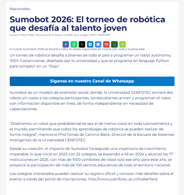 Un torneo de robótica desafía a jóvenes de todo el país a programar un robot autónomo, 100% Costarricense, diseñado por la universidad y que se programa en lenguaje Python para competir en un "Dojo". Sumobot es un modelo de extensión social, donde, la Universidad CENFOTEC enviará dos robots sin costo a los colegios participantes, los estudiantes arman y programan el robot con información disponible en línea, de forma independiente sin necesidad de capacitaciones. https://sinartdigital.com/trecenoticias/nacionales/item/sumobot-2026-el-torneo-de-robotica-que-desafia-al-talento-joven